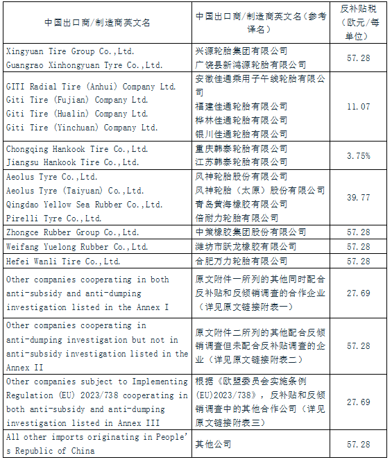2025年1月15日,欧盟委员会发布公告称,对原产于中国的全新或翻新卡客车轮胎(Pneumatic tyres, new or retreaded, of rubber, of a kind used for buses or lorries, with a load index exceeding 121)作出第一次反补贴日落复审终裁,决定继续对中国涉案产品征收反补贴税,反倾销税率为3.75-57.28欧元/每单位,具体税率见下表。涉案产品欧盟CN(Combined Nomenclature)编码为4011 20 90和4012 12 00(TARIC编码为 4012 12 00 10)。本案倾销调查期为2022年7月1日~2023年6月30日,损害调查期为2020年1月1日至倾销调查期结束。