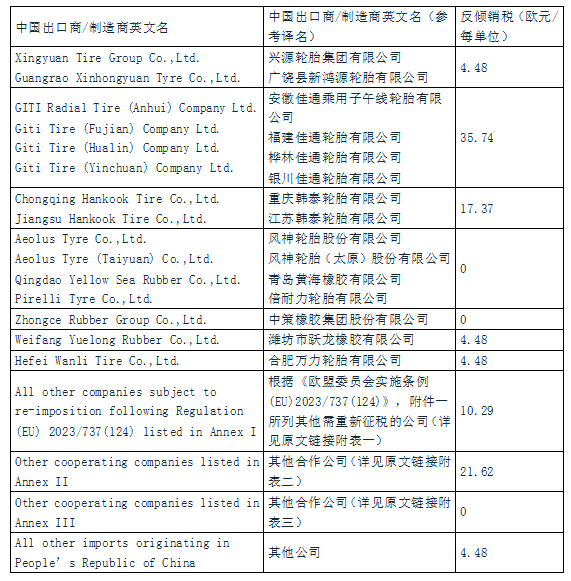 2025年1月15日,欧盟委员会发布公告称,对原产于中国的全新或翻新卡客车轮胎(Pneumatic tyres, new or retreaded, of rubber, of a kind used for buses or lorries, with a load index exceeding 121)作出第一次反倾销日落复审终裁,若取消反倾销措施,涉案产品的倾销对欧盟相关产业的损害会继续或再度发生,因此决定继续维持对中国涉案产品的反倾销税,反倾销税率为0-35.74欧元/每单位,具体税率见下表。涉案产品欧盟CN(Combined Nomenclature)编码为4011 20 90和4012 12 00(TARIC编码为 4012 12 00 10)。本案倾销调查期为2022年7月1日~2023年6月30日,损害调查期为2020年1月1日至倾销调查期结束。