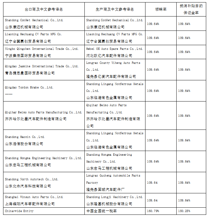 2025年1月24日,美国商务部宣布对进口自中国和土耳其的刹车鼓(Brake Drums)作出反倾销初裁,初步裁定中国生产商/出口商的倾销率为109.64%-160.79%(抵消补贴后的保证金调整为109.64%-150.25%,具体税率详见下表)、土耳其生产商/出口商的倾销率为12.73%-142.29%。美国商务部预计将于2025年6月16日对进口自中国和土耳其的涉案产品作出反倾销终裁。本案涉及美国海关编码8708.30.5020和8708.30.5090项下产品。