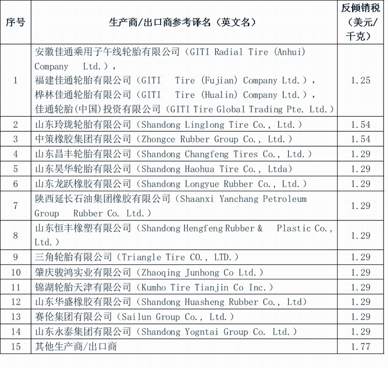 附表:巴西对华汽车轮胎第三次反倾销日落复审终裁征税表