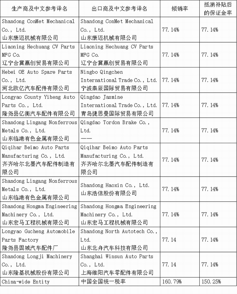 附表:中国出口商/生产商反倾销税率表