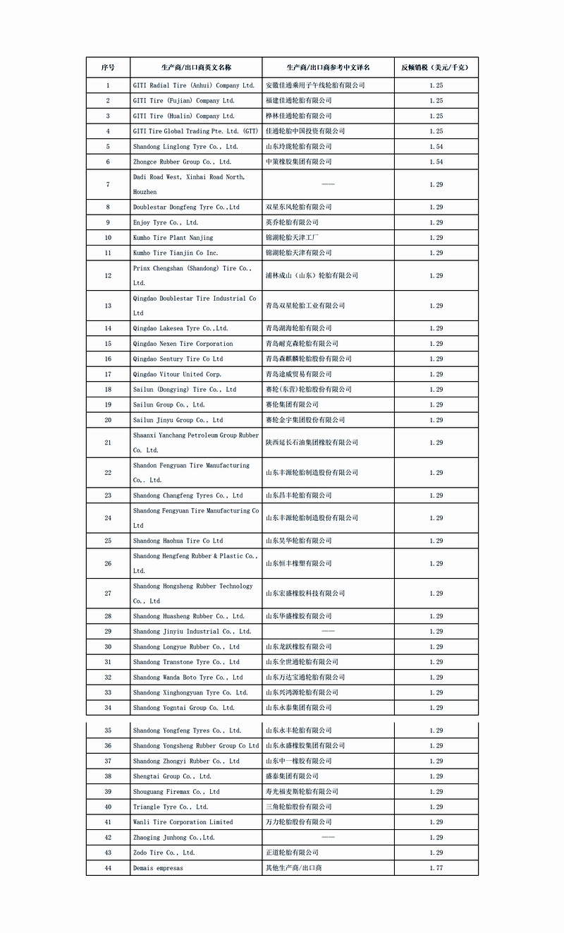 附表:巴西调整后的对华汽车轮胎第三次反倾销日落复审终裁征税表